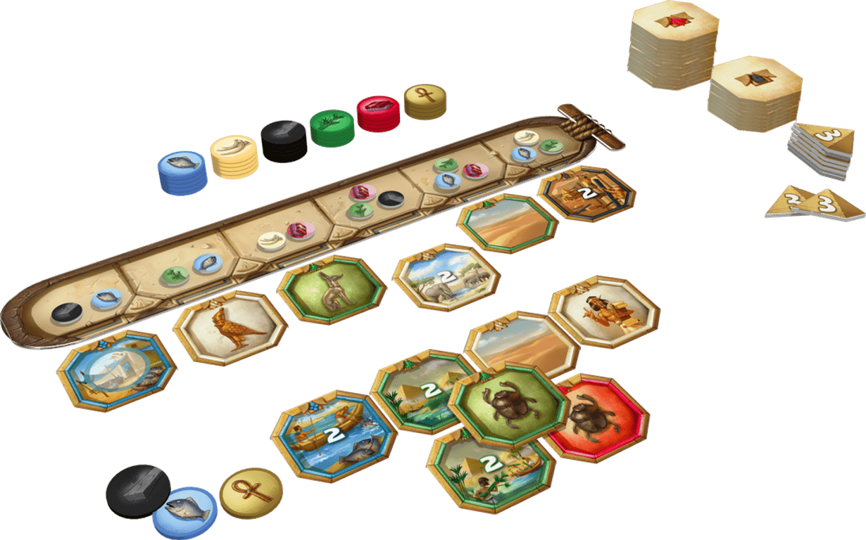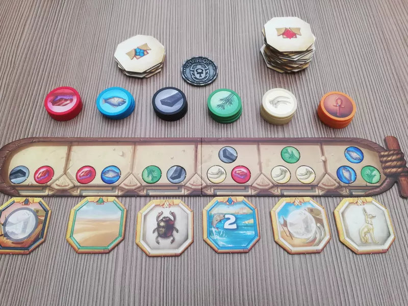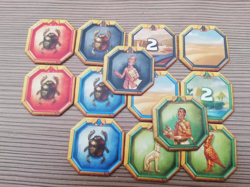 Ankh'or is a quick-playing resource management game in which each player on their turn either collects three types of tokens (with an ankh being a supplemental resource) or buys a tile from a marketplace and adds this tile to their structure, trying to connect tiles of the same color or bearing the same scarab while doing so. By spending an ankh, you can shift tiles in the marketplace and change the cost and type of goods needed to purchase them.
