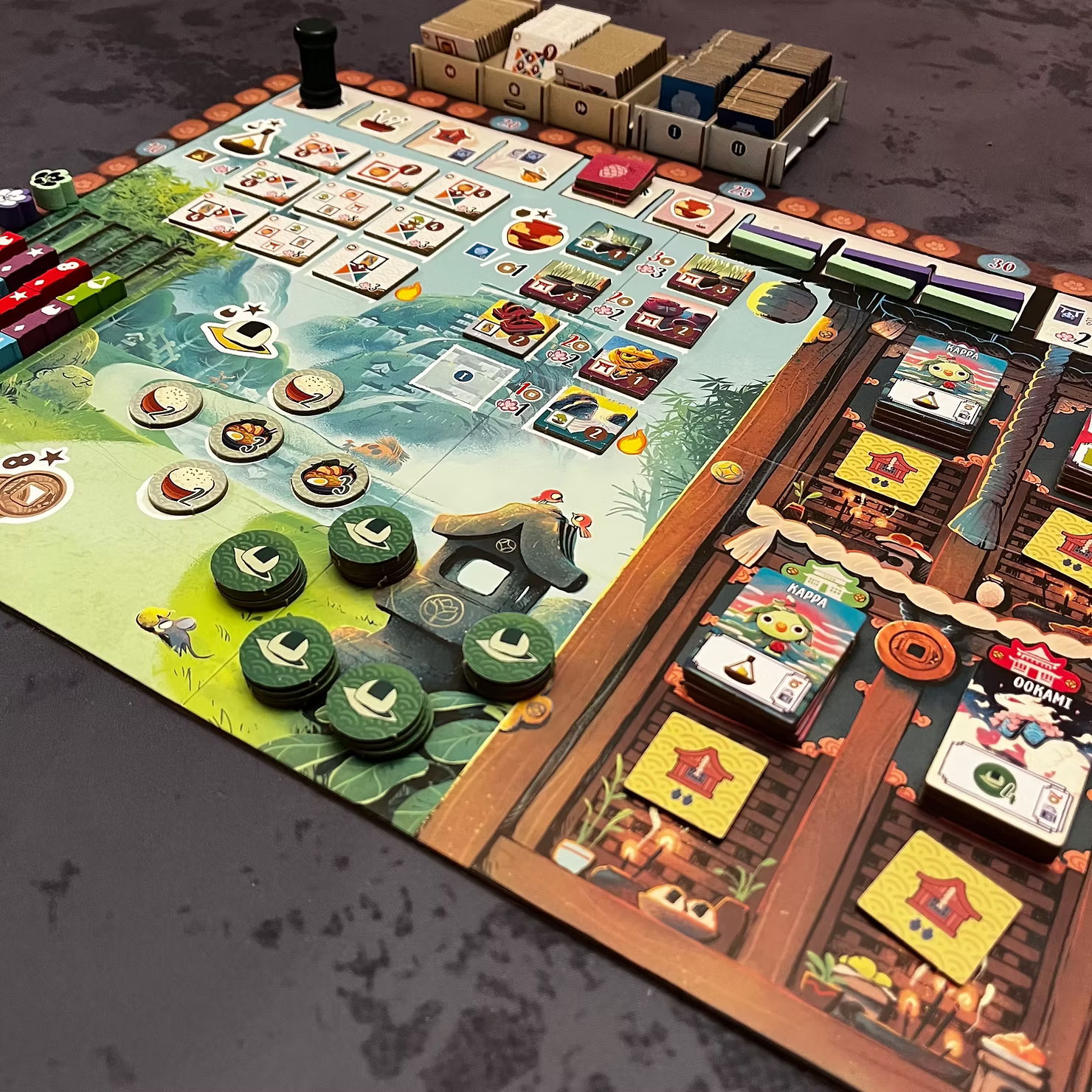 In addition to managing the household, players will need to prepare for when tough times come. To get through the winter, it will be necessary to feed the family members with the tea, rice or ramen that has been prepared and stored in the previous season. And all this without forgetting to honor spirits and ancestors in the temples. The player who has made the largest offering of incense in each sacred space will receive the favor of one of the seven spirits of the forest, as a token of thanks. Spirit tiles, in addition to helping players throughout the game, offer bonus points in the final phase based on the number of different spirits in each player's play area.
