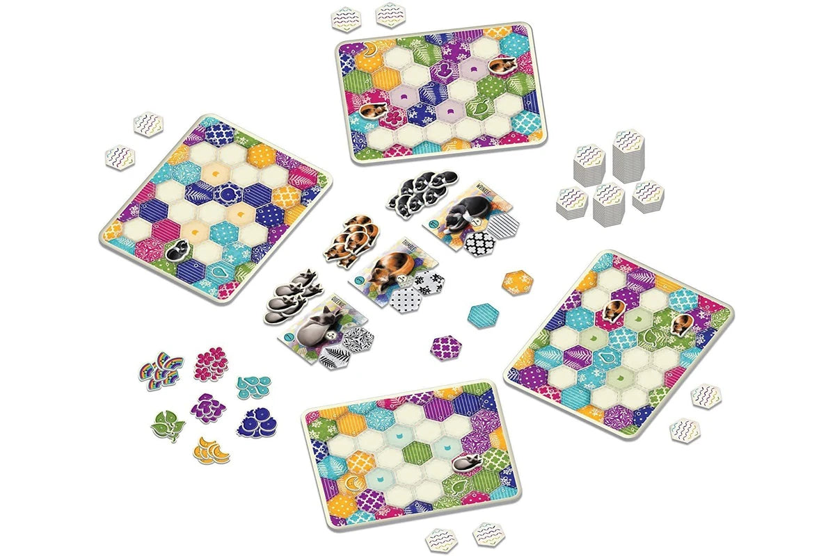 In Calico, players compete to sew the coziest quilt as they collect and place patches of different colors and patterns. Each quilt has a particular pattern that must be followed, and players are also trying to create color and pattern combinations that are not only aesthetically pleasing, but also able to attract the cuddliest cats!