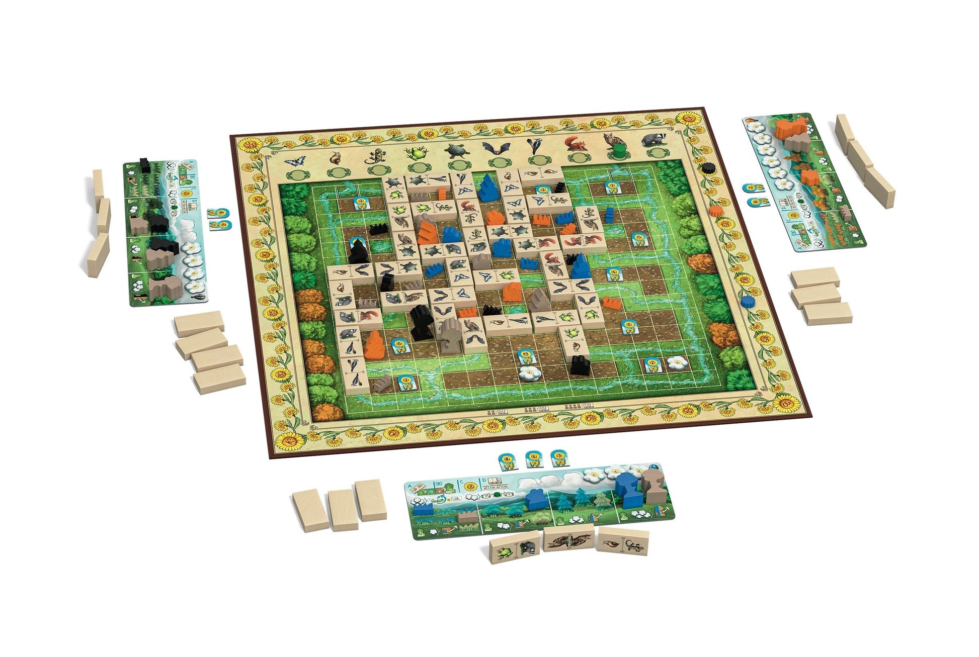 Each player gets a board with large pieces of wood in the form of turf, bushes, pines and oaks. These plants are used for the majorities on the large valley board and are available in a neutral color and in the respective player color. In addition, each player gets a stack of dominoes with two out of ten animal motifs on each of them.