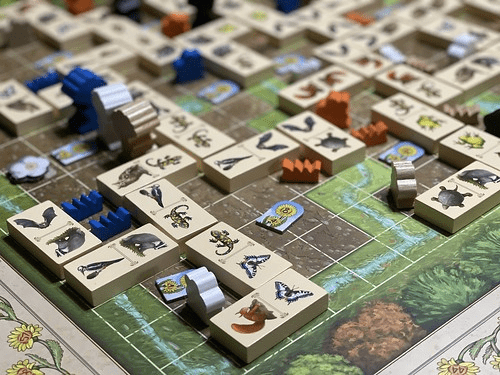 On your turn, place one of the three dominoes in your hand on two brook spaces of the valley board. Of course, the domino must be adjacent to another domino that shows the same animal. If the placed domino borders a free space of a brown area, you can decide whether a tuft of grass or any other of your plants should be placed on that space. Tufts of turf have a value of 1, bushes of 2, pines of 3 and oaks of 4. After placing the plant, you score points for it and every plant piece that is already in this brown area and has the same or a lower value.