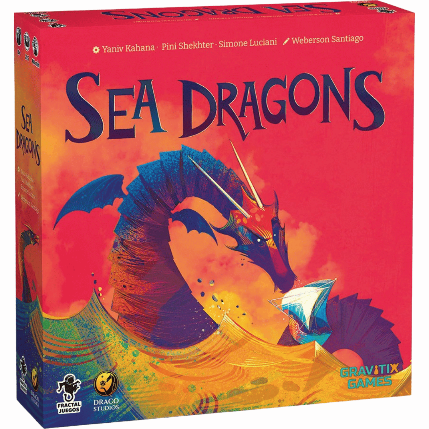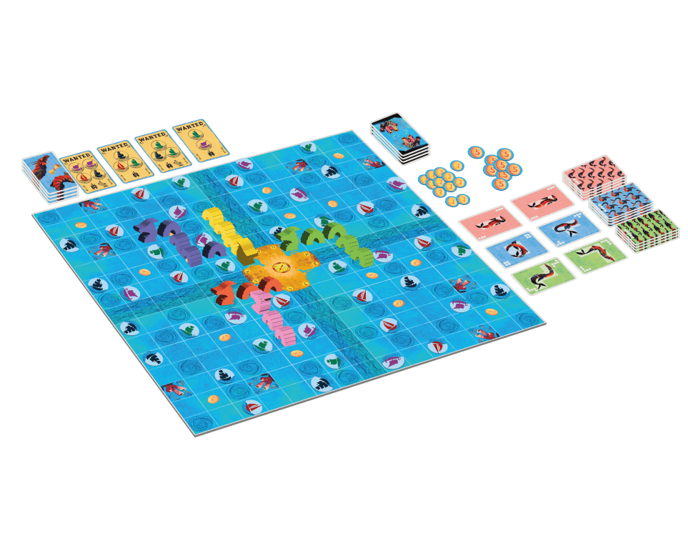 In the game, each participant plays as a family of sea dragons who are seeking to become the protectors of the forbidden seas. Each turn, one of the two pattern cards from the hand will be played to position a sea dragon on the board, increasing your presence in all four sea kingdoms. You will be able to sink ships or collect treasures hidden in the ocean. Optionally you can complete missions with the ships that you are sinking. Note that you cannot place your own sea dragons next to each other, and if you place one next to another player's dragon, they receive treasures.