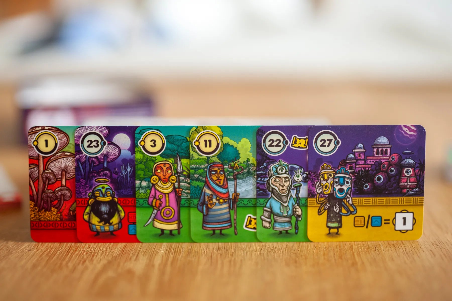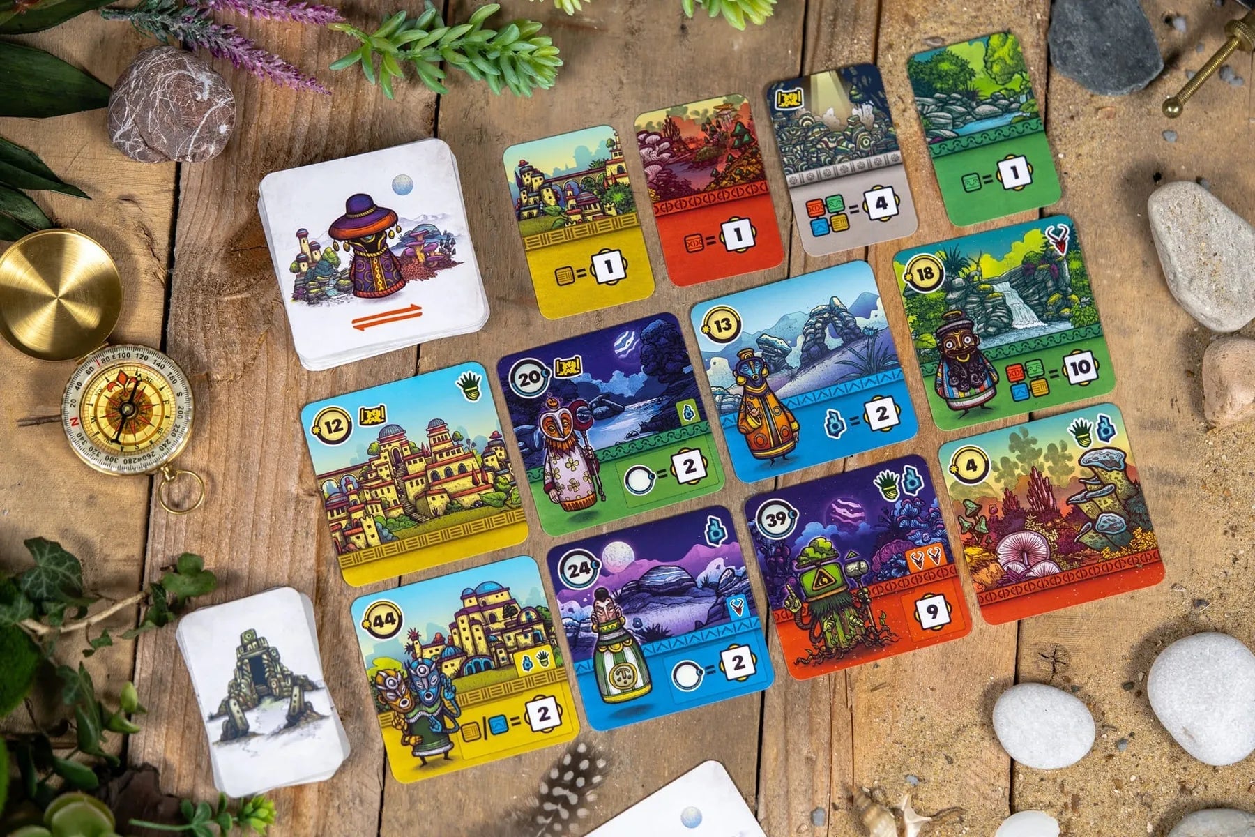 Elke beurt speel je een kaart uit je hand van 3. Daarna pak je een nieuwe kaart van de openliggende rivier. Omdat Faraway simultaan wordt gespeeld, moet je bij al je keuzes rekening houden met een slim prioriteitssysteem – als je als laatste een kaart pakt, heb je minder opties en vaak minder winstgevende keuzes voor de volgende beurten.