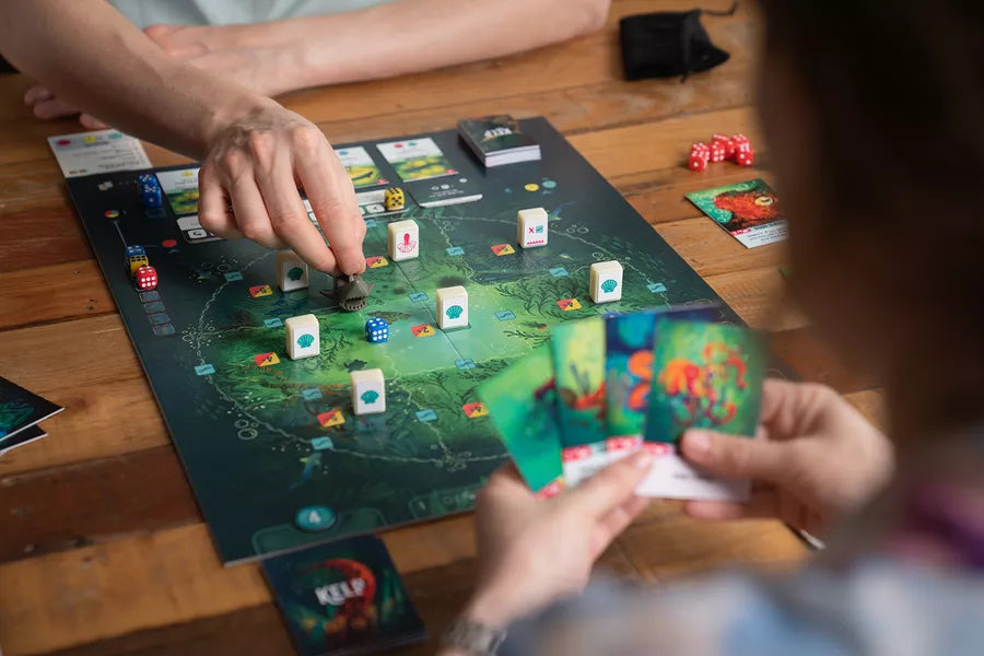 Kelp Dit is een asymmetrisch spel voor twee spelers dat spelers een unieke kans biedt om zich te verdiepen in de natuurlijke wereld van Pyjama Sharks en Common Octopuses, gesitueerd in een Zuid-Afrikaans kelpwoud. Verstoppertje spelen ontmoet bluf en manipulatie. Een combinatie van deckbuilding en dobbelspel.