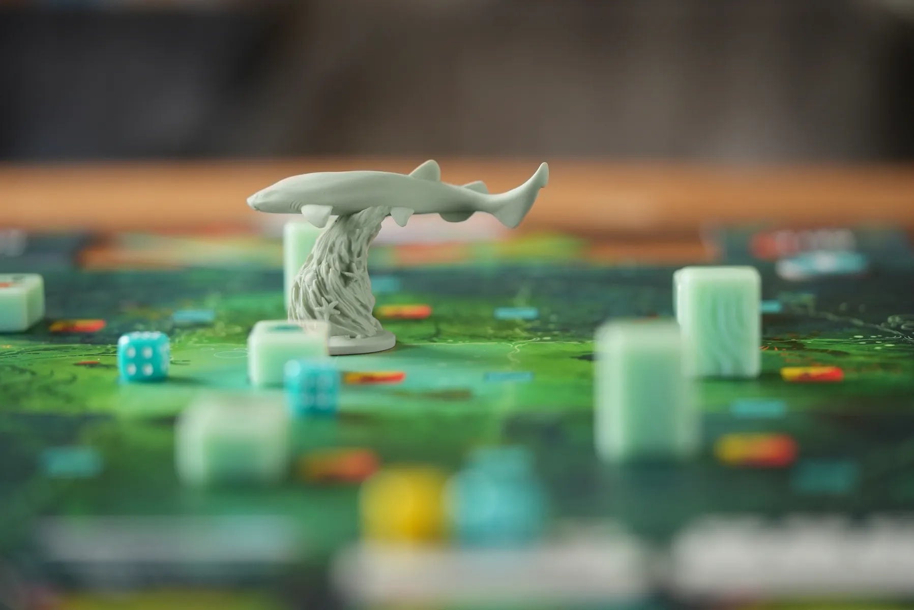 Spelers kruipen in de huid van deze iconische zeedieren en ontdekken dat de spelmechanismen sterk lijken op die van hun echte tegenhangers. Elk dier heeft een unieke weg naar de overwinning. De octopus, bekend om zijn sluwheid en aanpassingsvermogen, sluipt over het speelbord door kaarten te spelen en de verborgen en zichtbare blokken te beheren, waarbij hij gebruikmaakt van het opmerkelijke vermogen van het dier om zich te camoufleren en te misleiden. De haai, de belichaming van het meedogenloze en vastberaden roofdier, patrouilleert daarentegen in zijn territorium en probeert de ongrijpbare octopus te vangen door met dobbelstenen te gooien en speciale vaardigheden te gebruiken om zijn geluk te beïnvloeden, waarmee hij de natuurlijke instincten en het roofzuchtige gedrag van het dier laat zien. Het spel is een spannende mix van deckbuilding en het bouwen van dobbelstenen, maar ook van verstoppertje spelen, bluf en manipulatie.