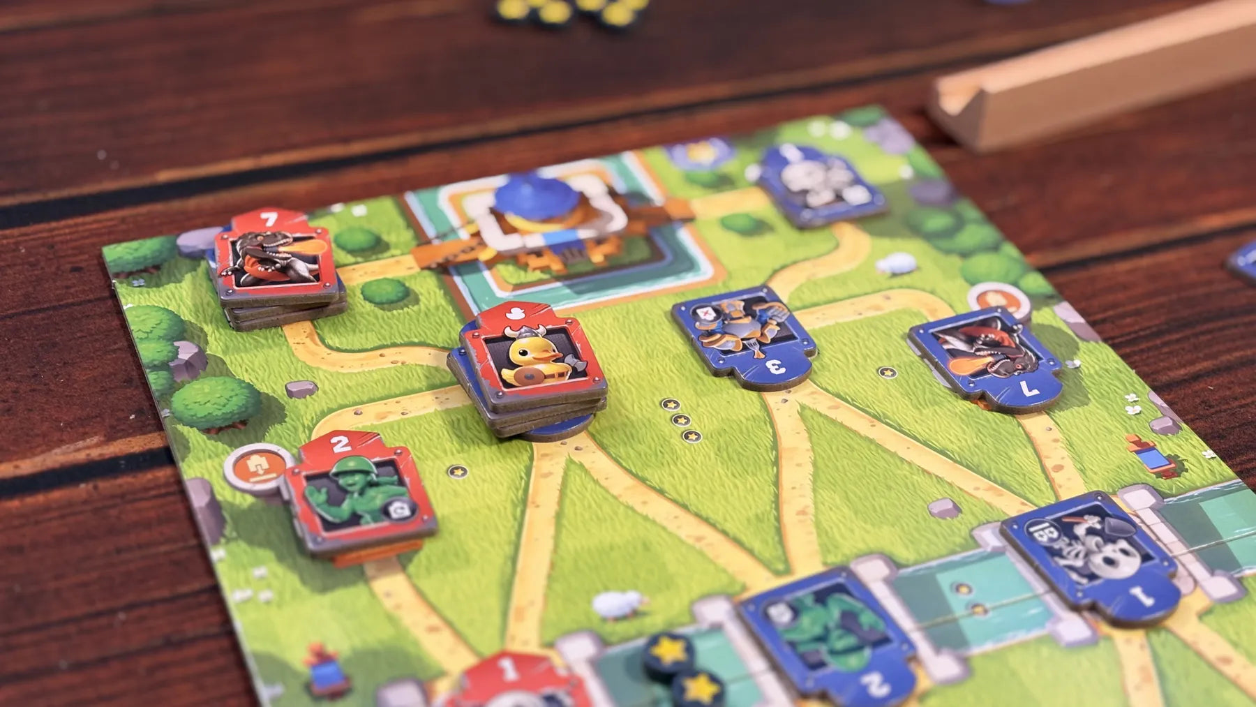 Wanneer het jouw beurt is Bij Toy Battle trek je ofwel twee speelgoedtroepen, of je plaatst een troep op het speelbord en activeert het effect ervan. Wanneer je een troep plaatst, kun je deze op een lege basis plaatsen, op een basis die je beheert, op een basis die de vijand beheert met een troep van lagere waarde dan degene die je plaatst, of op het hoofdkwartier van de vijand. In alle gevallen moet je de troep echter plaatsen op een locatie die een ononderbroken pad naar je eigen hoofdkwartier heeft via bases die je beheert. Bezetten , dat wil zeggen, bases die jouw troepen bevatten. Als je bases bezet die een aaneengesloten pad rond een regio vormen, claim je de medailles binnen die regio. (Je verliest deze medailles niet als de vijand later een van deze bases bezet.)