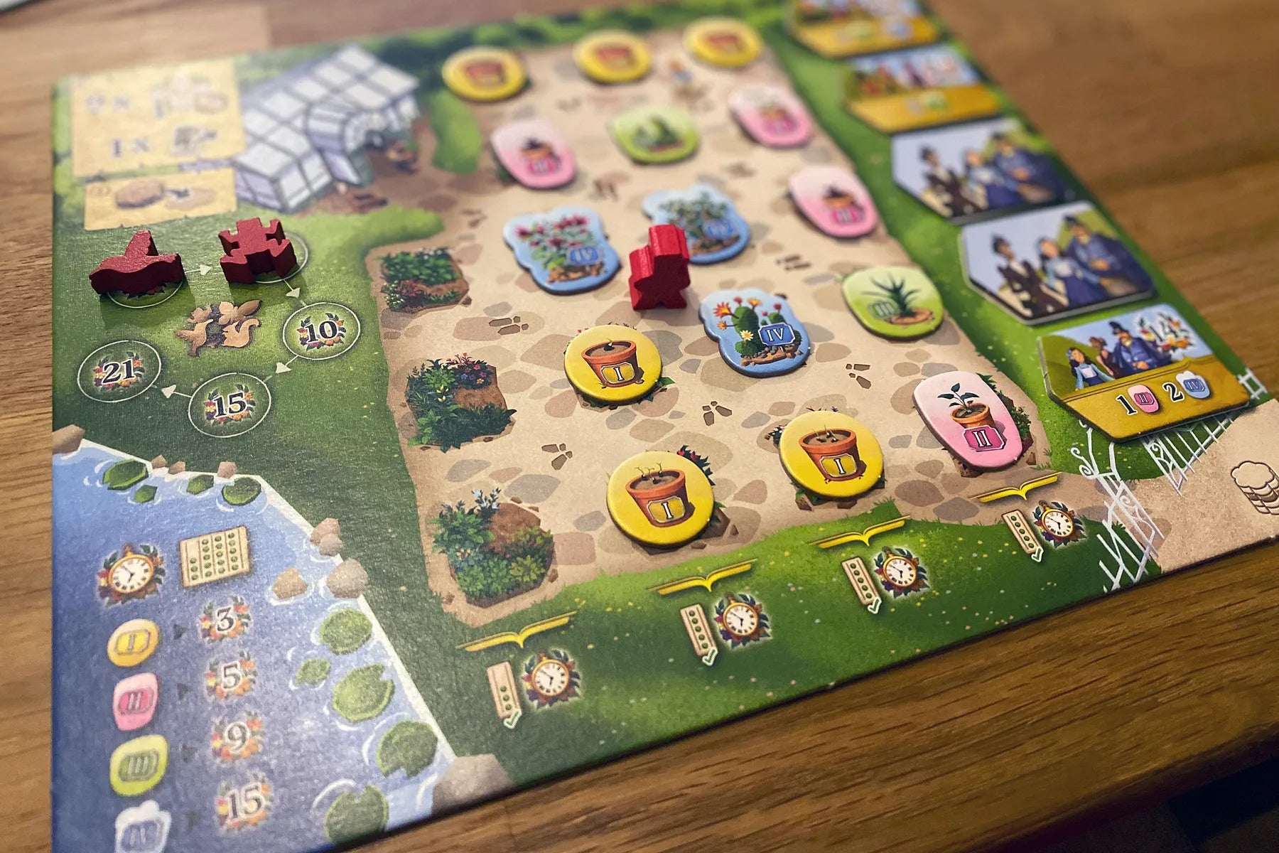 In Botanicus, you compete for the best action-spots in a unique selection mechanism, and then make the most of the options available to you. You have to collect new plants, take care of them, water them and keep an eye on the gardener. Last but not least, you have to collect some money along the way to pay for all this.