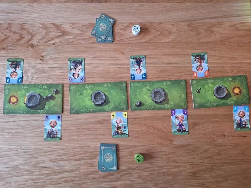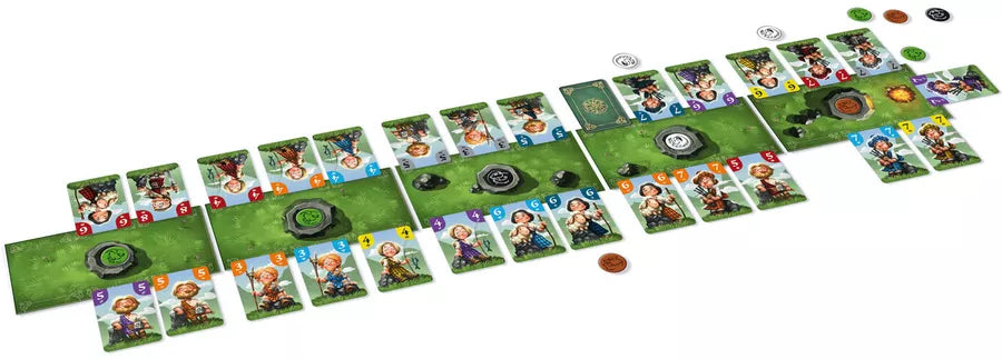 To set up, lay out 4-6 landscape boards depending on the player count and place random cards from the deck in certain locations. Each card is one of seven colors and is valued 3-8. On a turn, a player places a card from their hand in an empty space next to or across from a card of the same color or value, then optionally places one of their five clan tokens on the same location board where they placed a card.