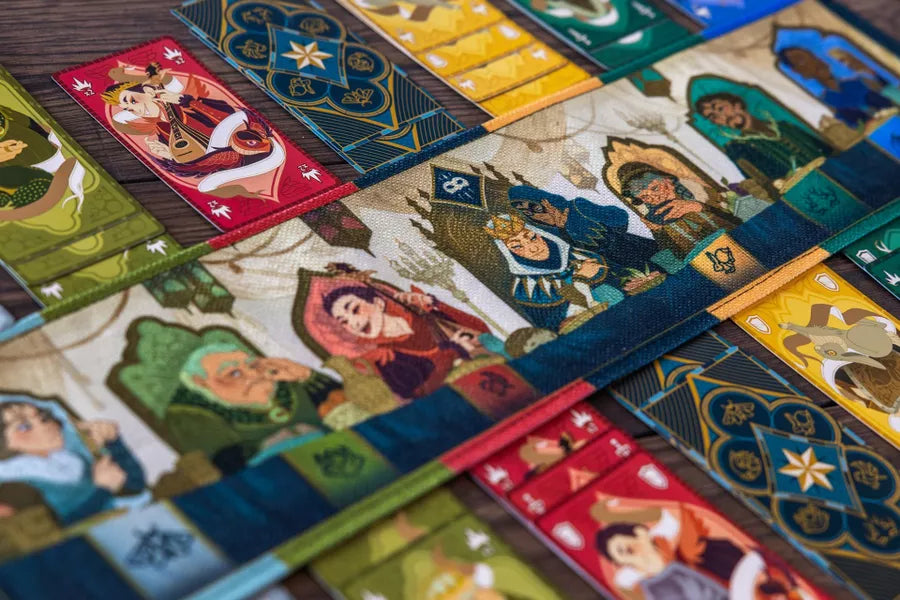 In Courtisans, you receive and play three cards on each of your turns. One is played at the Queen's table to sway a family's influence, whether in a positive or negative manner. The two other cards are played in your domain and in an opponent's domain, and they can be worth positive or negative points, depending on their family's status at the end of the game. Choose where best to place your three cards if you want to end up with the most points and win.