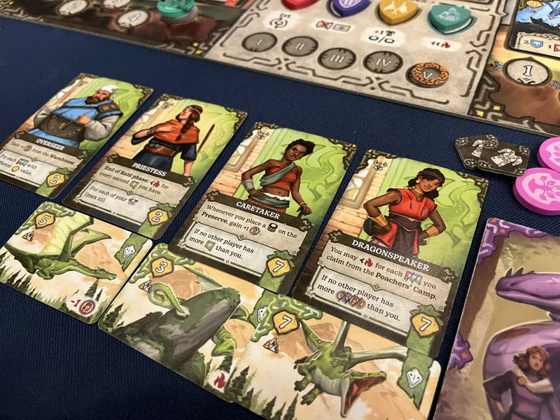 The locations’ rewards allow you to recruit Heroes with unique abilities, rescue Dragons from the poachers’ grasp to get them to safety in matching Preserves, and launch counterattacks against the poachers. In the heat of some actions, and during the Poachers’ Raid at the end of each round, you may get burned, and advancing too far on the Flame track will take its toll at the end of the game.