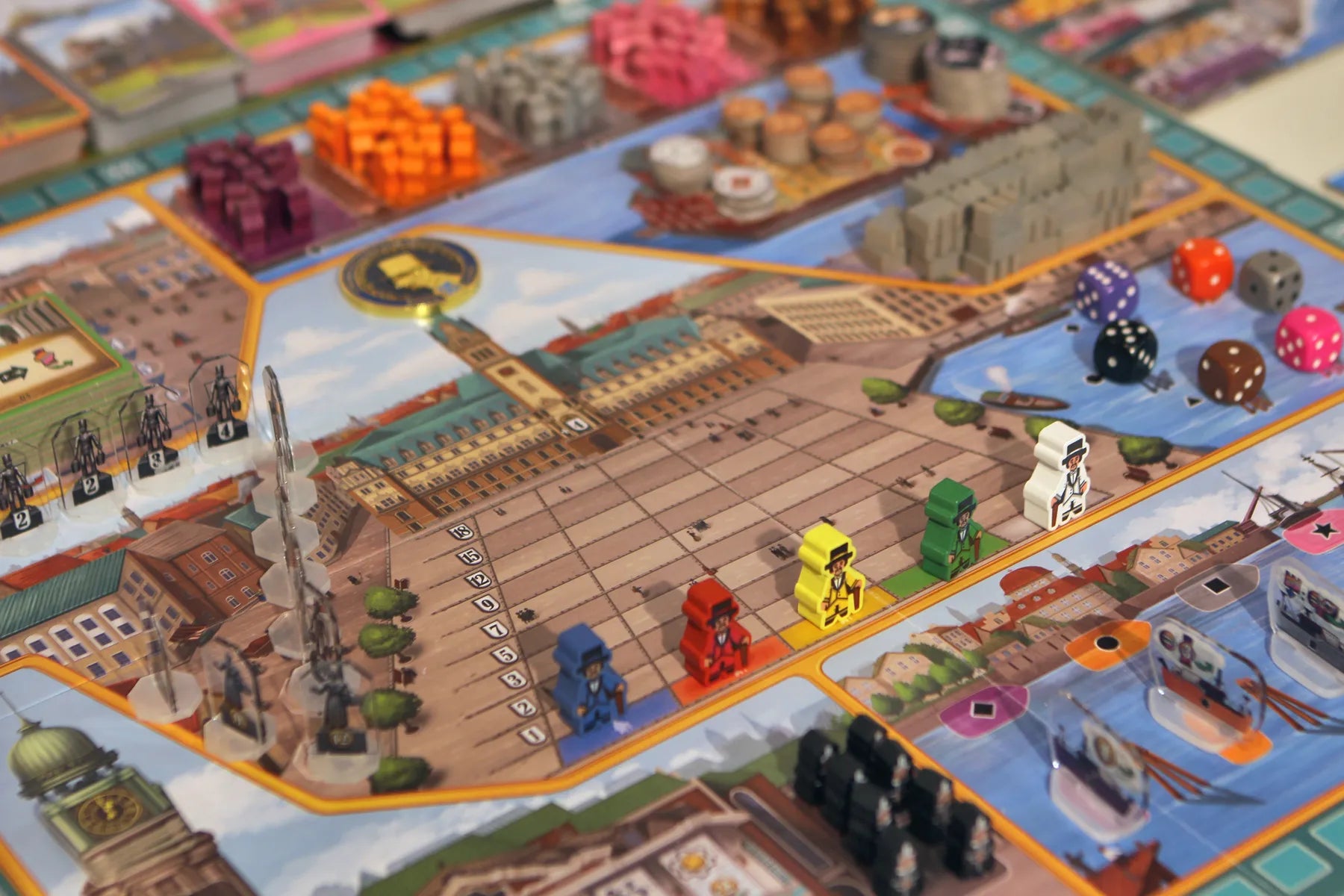 In the game, players act as mayors of the city of Hamburg in the late 19th century. The game is played over eight rounds. At the beginning of the round, six colored dice are rolled, with players receiving a threat marker in the color of any die that rolls a 5 or 6. The black die is a "wild" threat, with players drawing a threat token with one of the other threat types hidden on the back. If a player ever has three of one type of threat, they receive a penalty.