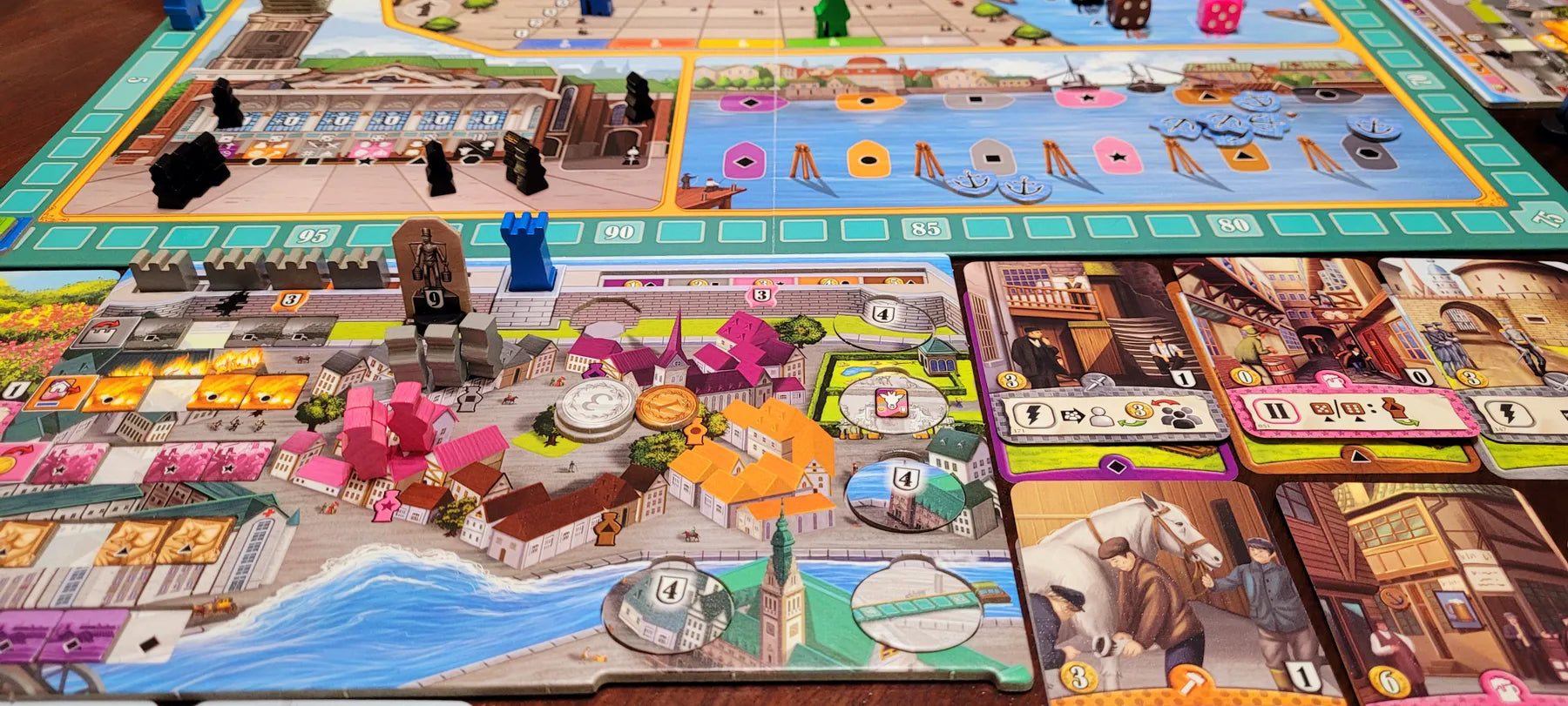 On their turn, players play five cards from any of five stacks of cards, one for each of the five colors in the game. These cards are in thirteen categories, each representing a different location around Hamburg, with seventeen individual cards within each category. Each card in a player's hand may be used for a number of purposes, including building the city wall, activating boats (if a 3 or 4 is rolled), starting a building plot, and constructing a building (card) on the plot, with this building granting a new ability or endgame scoring condition.