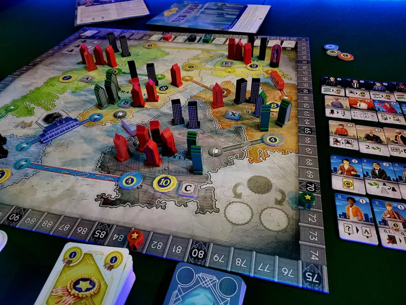 The game is played over five rounds (there are six boroughs, one is randomly not visited each game). Each game, the value of boroughs is randomly assigned, and the player with the most skyscrapers in a a borough receives full value, and the next player receiving half, and so on. There is also a bonus for building in every borough. Points are also awarded for certain characters, and the player with the most points is the winner.
