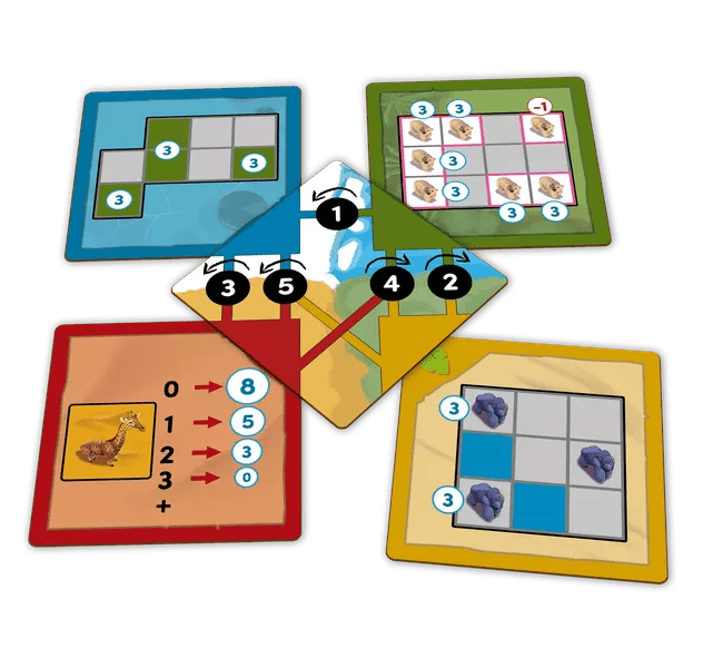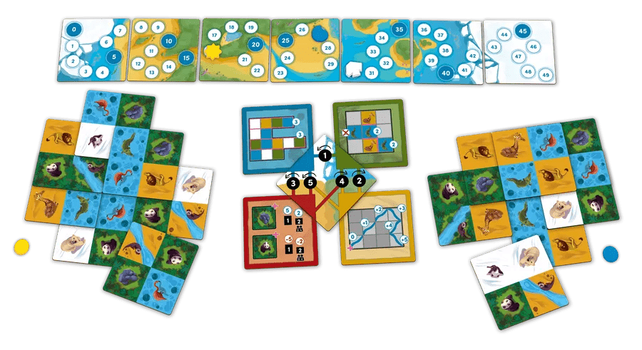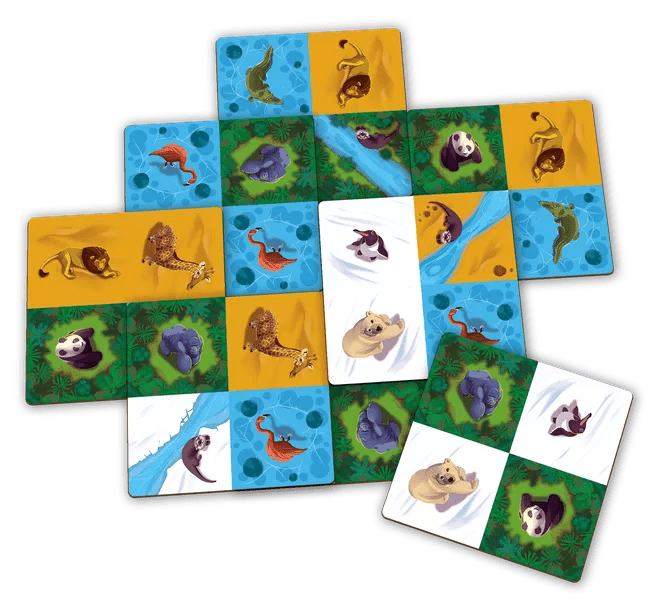 Each round, players will draw 3 cards, place one, and pass the rest (simple drafting phase). Each card is composed of 4 biomes, each containing an animal. When you place a card, you must cover AT LEAST one biome. The whole Sanctuary must not exceed 6 x 6.