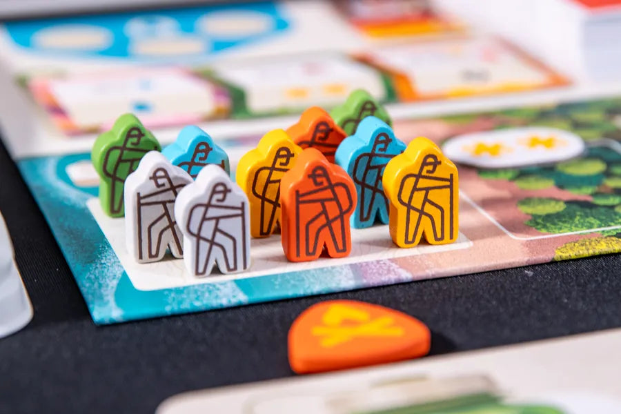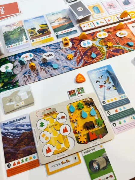 Over the course of three rounds (called Seasons), your two hikers will make their way along the path, stopping at trail sites, collecting resources to visit parks, taking photos of beautiful vistas, and encountering wildlife. Along the way, you’ll get gear to upgrade your experience, spend a night at a campsite, fill your canteen for special bonuses, and indulge your unique passion for the outdoors.