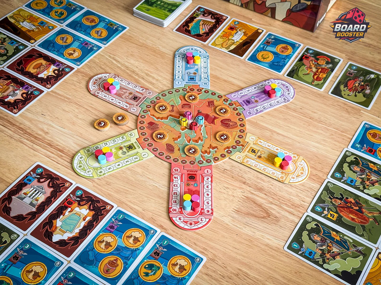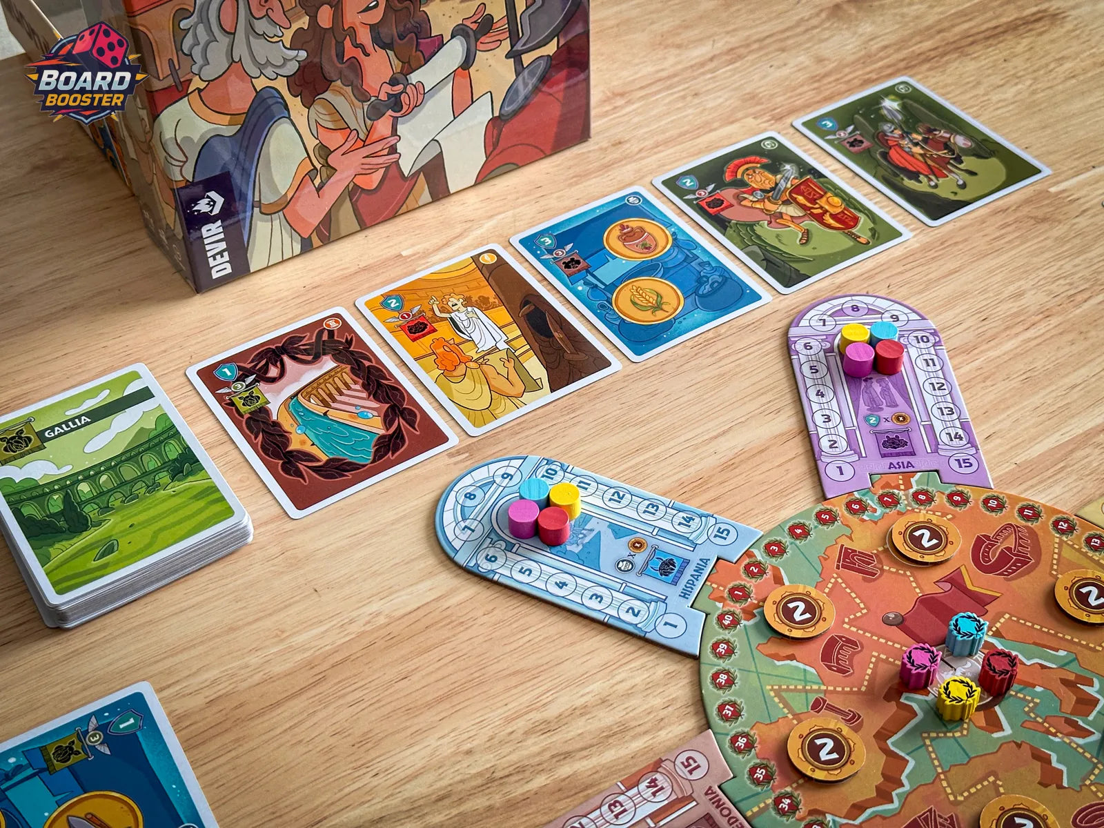 In Quorum, the players take on the role of Roman senators who share the power of Rome and its provinces with the aim of acquiring the greatest amount of influence possible. The goal is to be the most powerful and influential senator by gaining victory points, which are awarded in various areas of influence over the twelve rounds of the game.