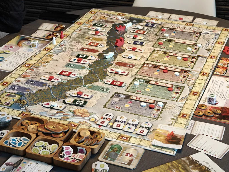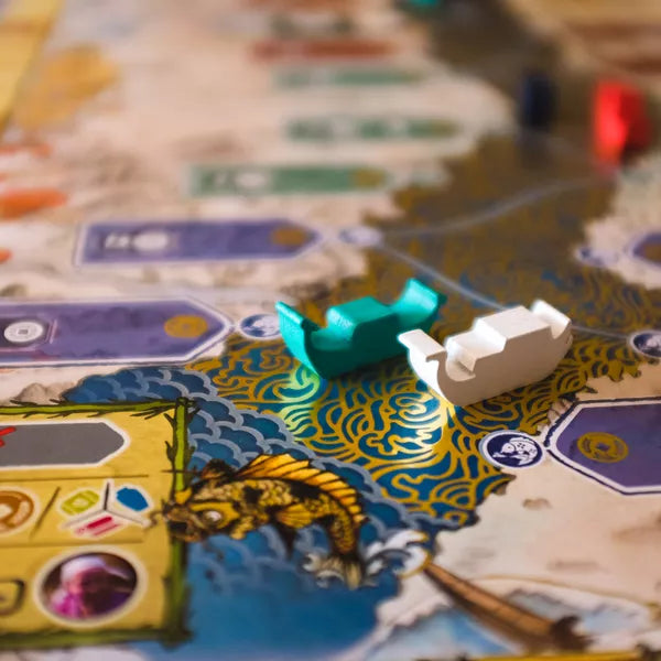 In River of Gold, players take on the role of river merchants allied with legendary samurai clans, each vying to exploit the river to earn wealth, glory, and wisdom. Will you invest in developing ports, markets, shrines, and more along the banks of the busy river? Or will you rely upon sailing the river of gold, growing your wealth and influence through delivery contracts, visiting the nobility, and garnering a bit of divine favor during tough times?