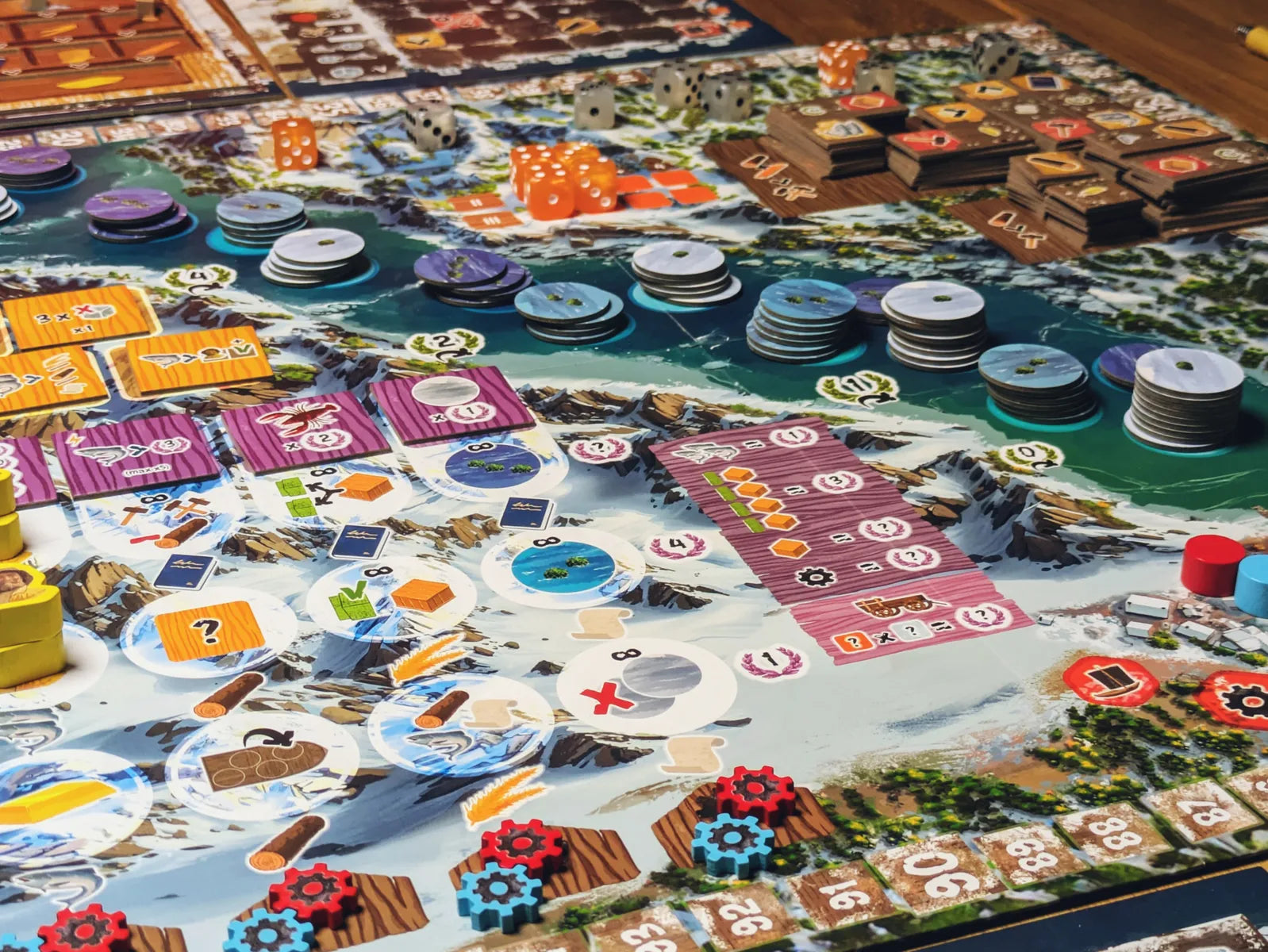 Over three rounds, players draft dice to activate buildings in their settlement. This provides resources as well as activating actions such as sending out your fishing boat, advancing along the various technology tracks, completing trade orders, or erecting new buildings. Each player's player board shows a grid. When you draft a die, you activate all buildings in the row or column corresponding to that die. By erecting buildings in your settlement, each die can activate more buildings.