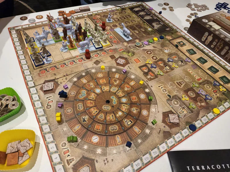 In Terracotta Army, you represent talented craftsmen and artists laboring to build the wondrous assembly of statues. During the game, you collect resources, upgrade your workers, and seek favor with the Emperor's advisors. Your goal is to play a crucial role in the process of creating the terracotta army, and your success is measured in victory points (VPs). During the game, you and your fellow players build the army together, but after the fifth round of the game is over, only one of you — the one with the most points — will stand as the winner.