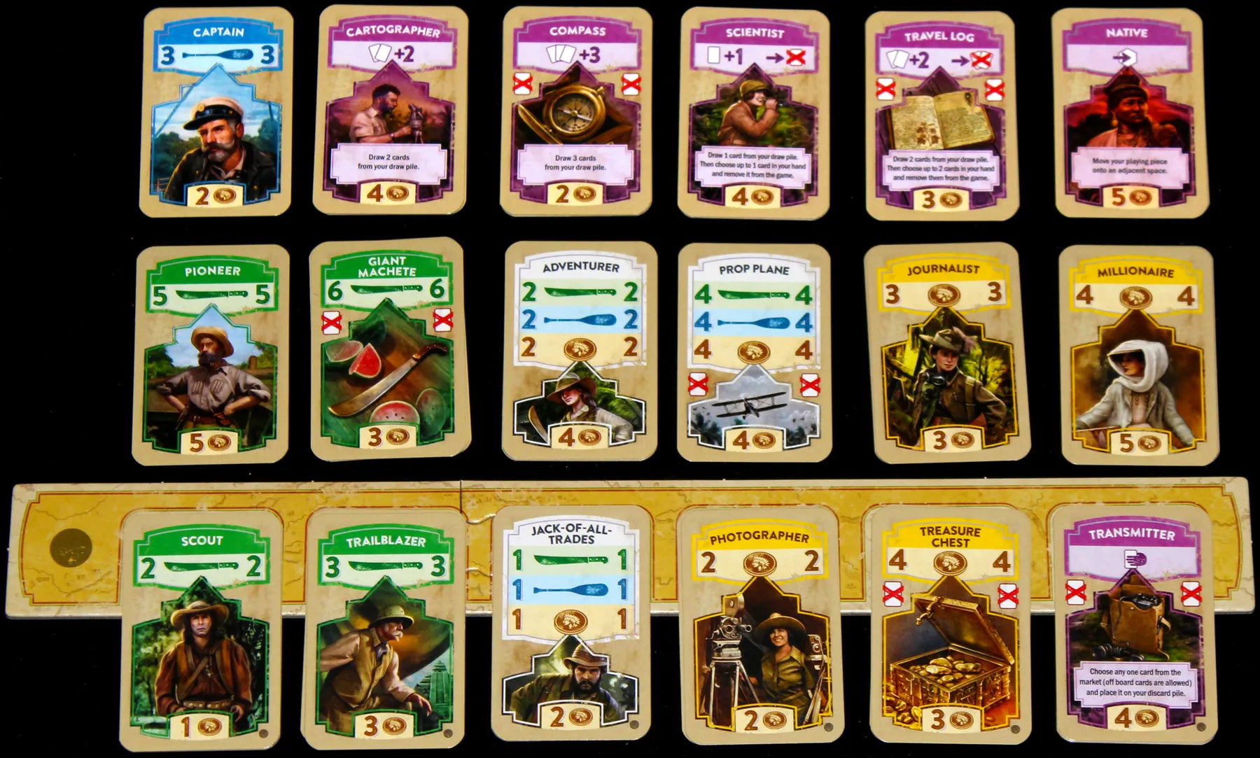 Each player starts with a face-down deck of 8 cards— his or her expedition —to draw from. You start each turn with 4 cards in your hand. Use expedition cards to move through the jungle or hire more people for your expedition. Each card in your hand can only be used once per turn - to move or to buy 1 new card.